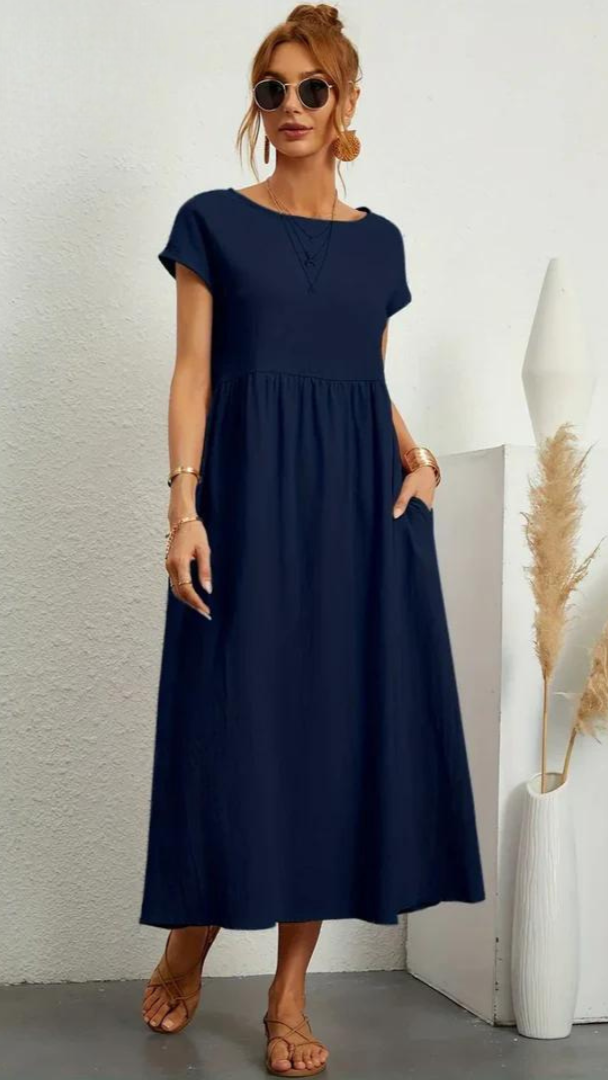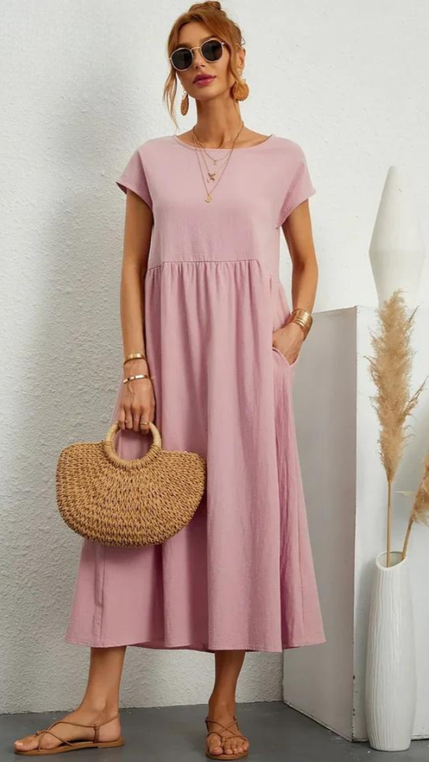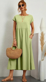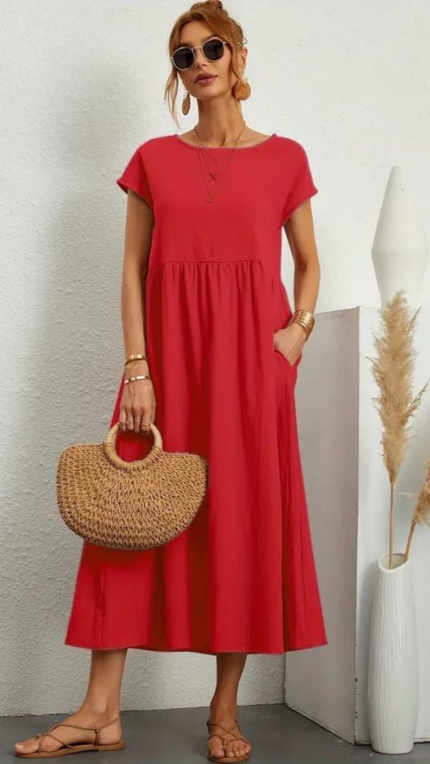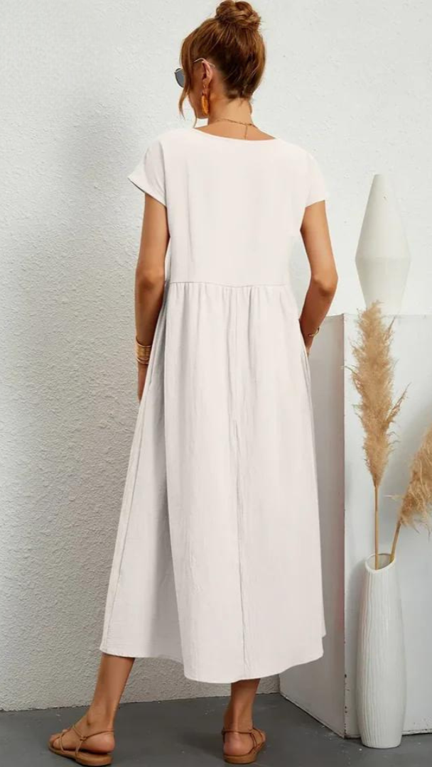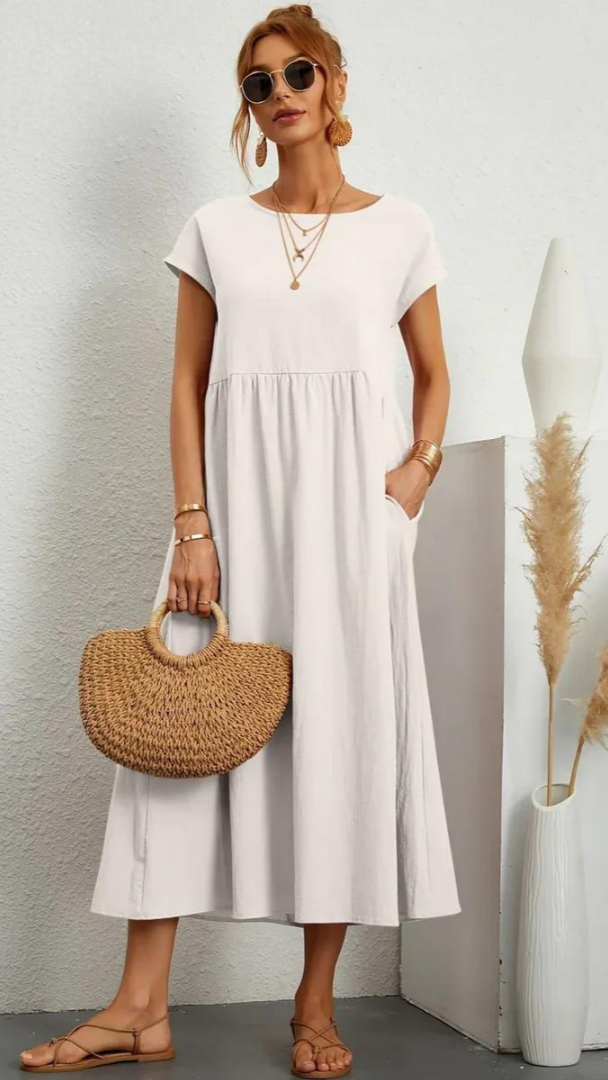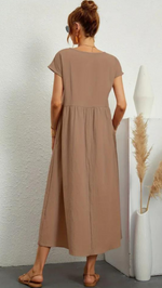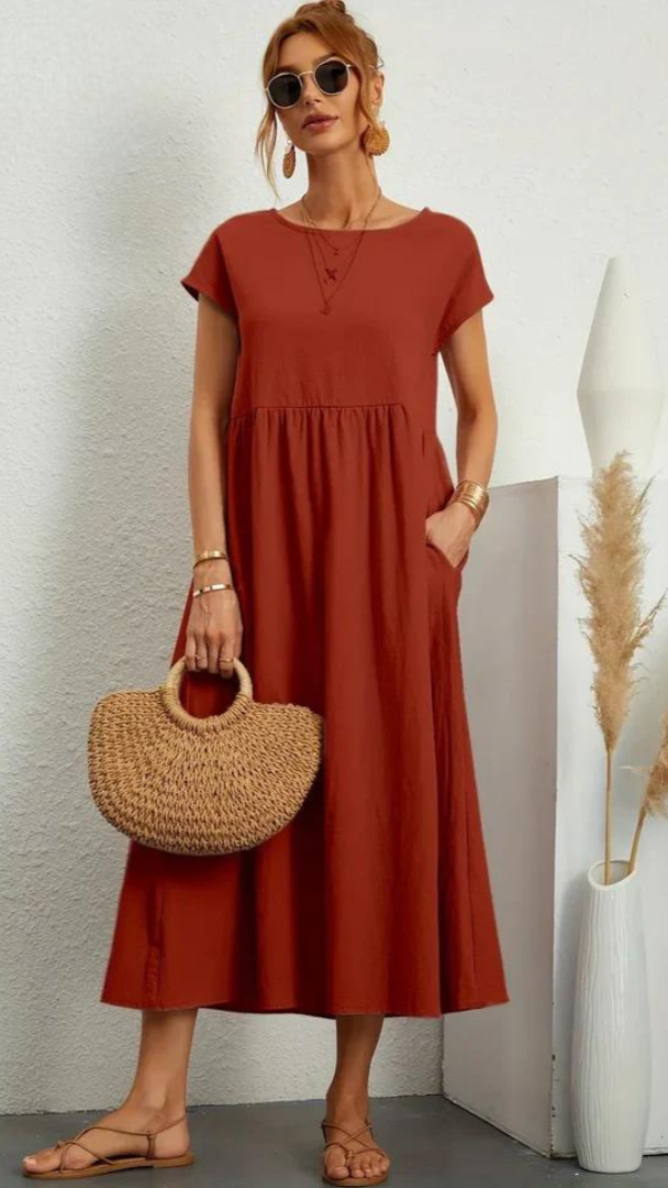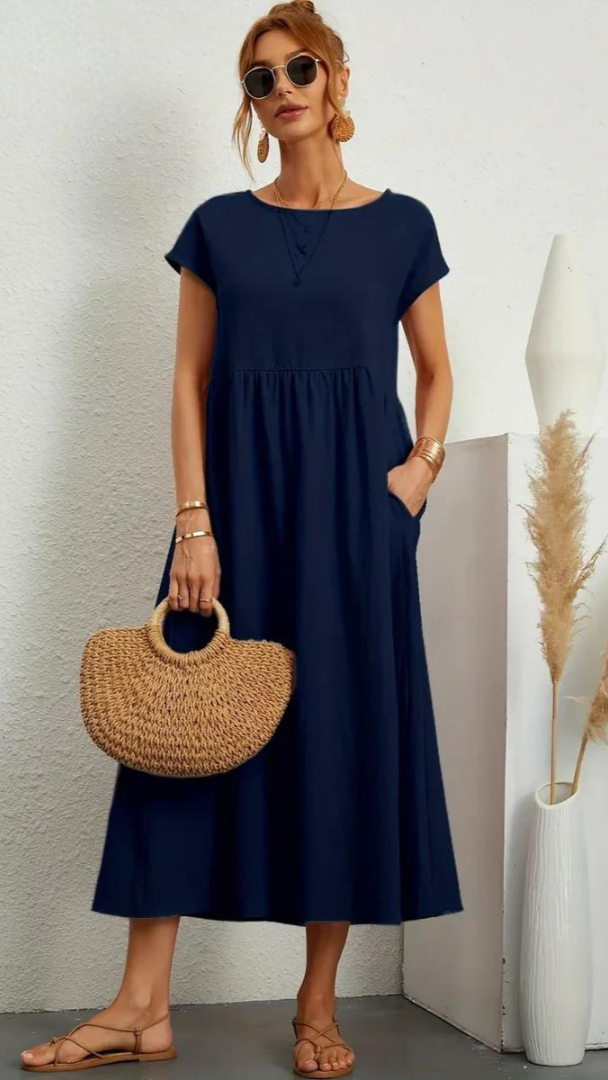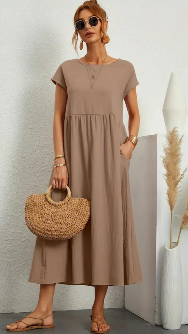 Das Kleid Héloïse aus weicher und atmungsaktiver Baumwolle bietet höchsten Tragekomfort und einen fließenden Schnitt, der jeder Figur schmeichelt, ohne einzuengen. Ideal, um Bauch, Hüften und Arme dezent zu kaschieren, kann es beim Spaziergang, im Urlaub oder an einem Sommerabend getragen werden.