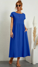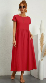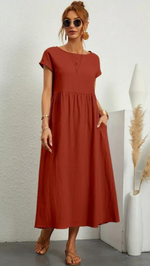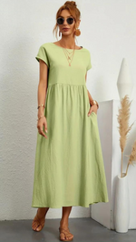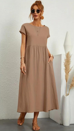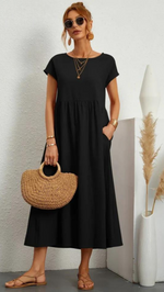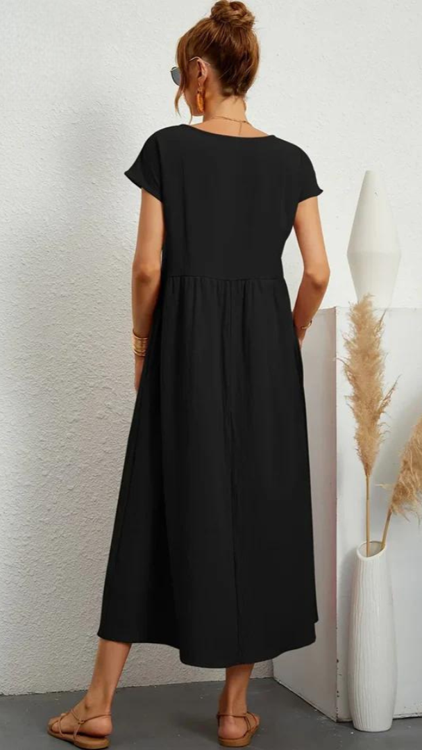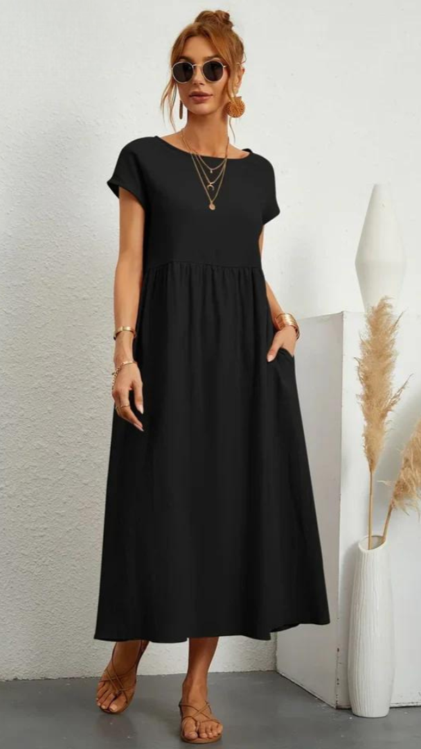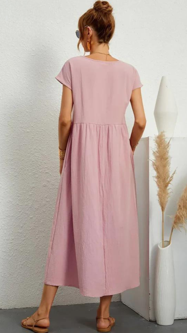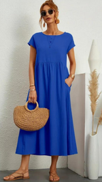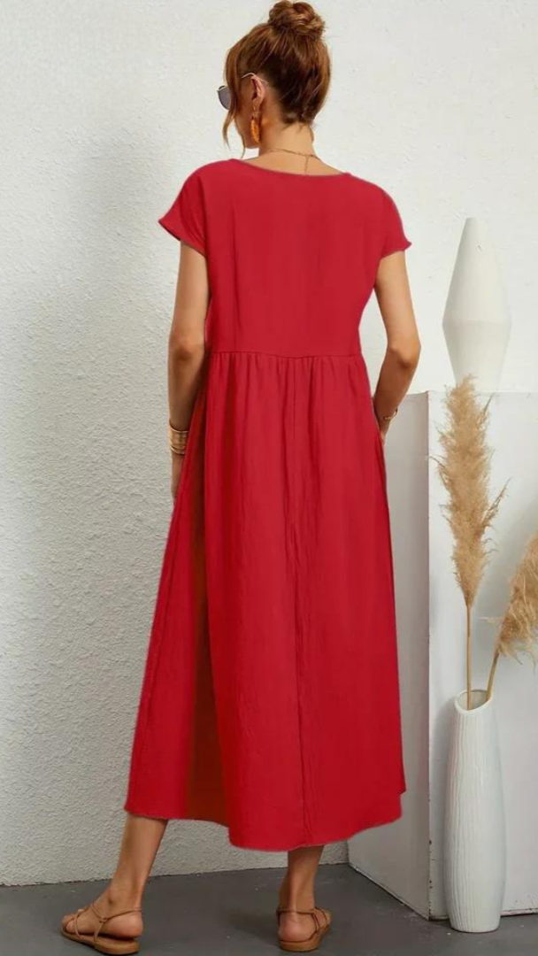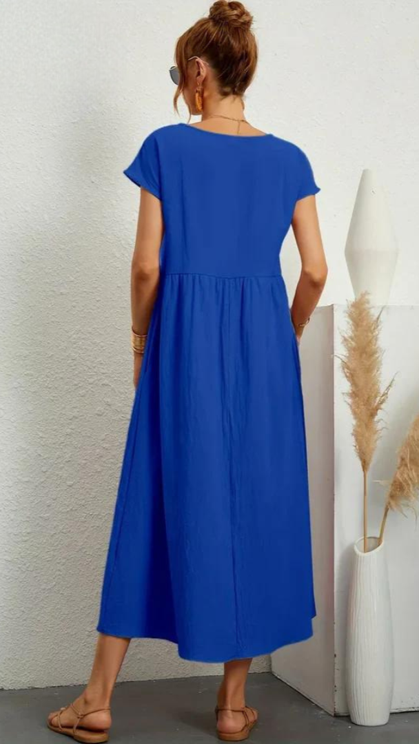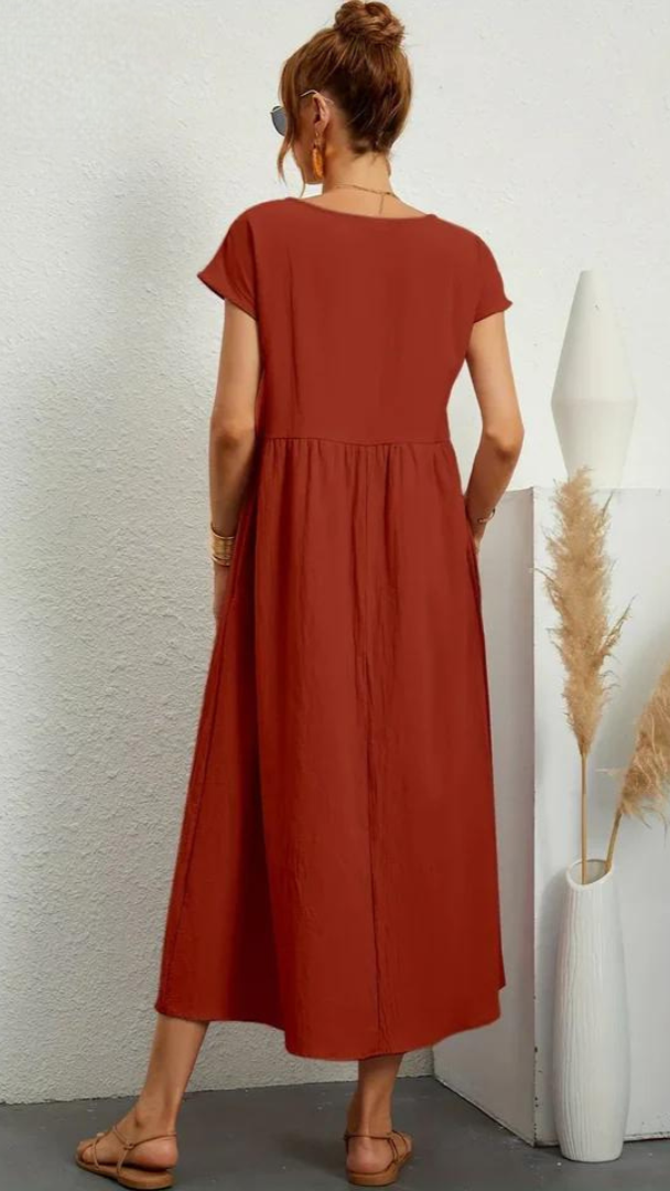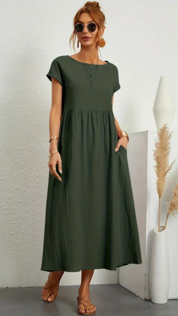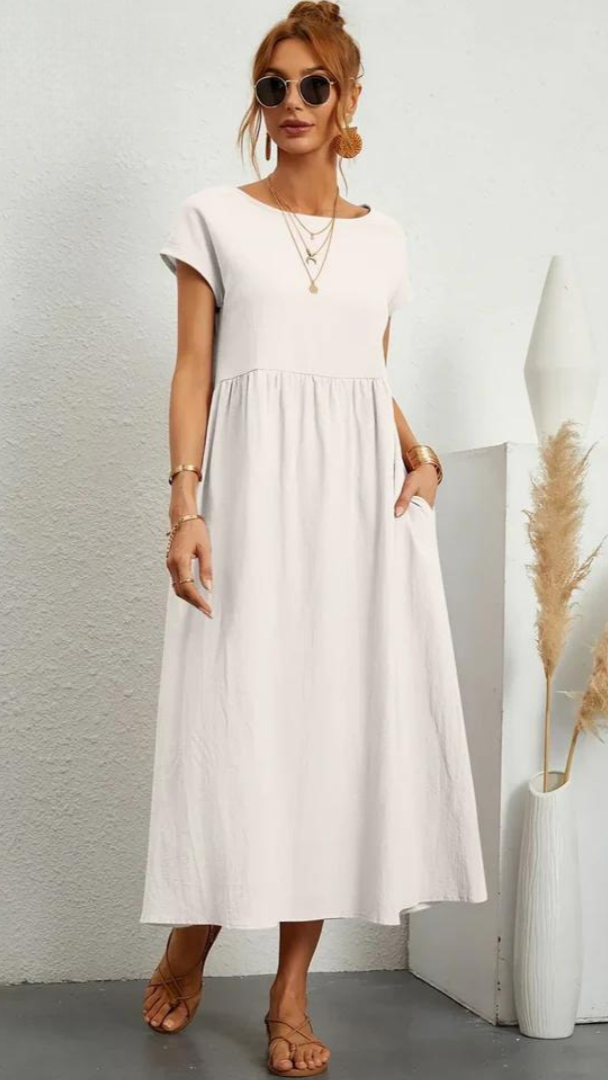 Das Kleid Héloïse aus weicher und atmungsaktiver Baumwolle bietet höchsten Tragekomfort und einen fließenden Schnitt, der jeder Figur schmeichelt, ohne einzuengen. Ideal, um Bauch, Hüften und Arme dezent zu kaschieren, kann es beim Spaziergang, im Urlaub oder an einem Sommerabend getragen werden.