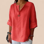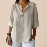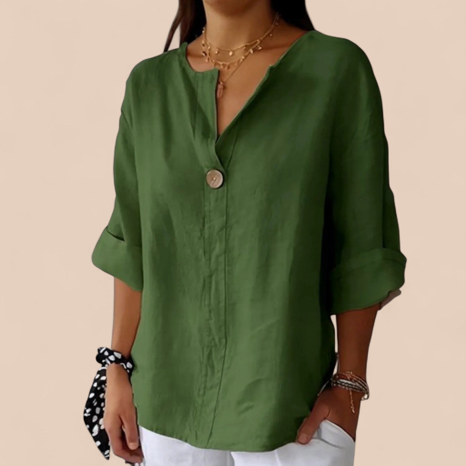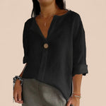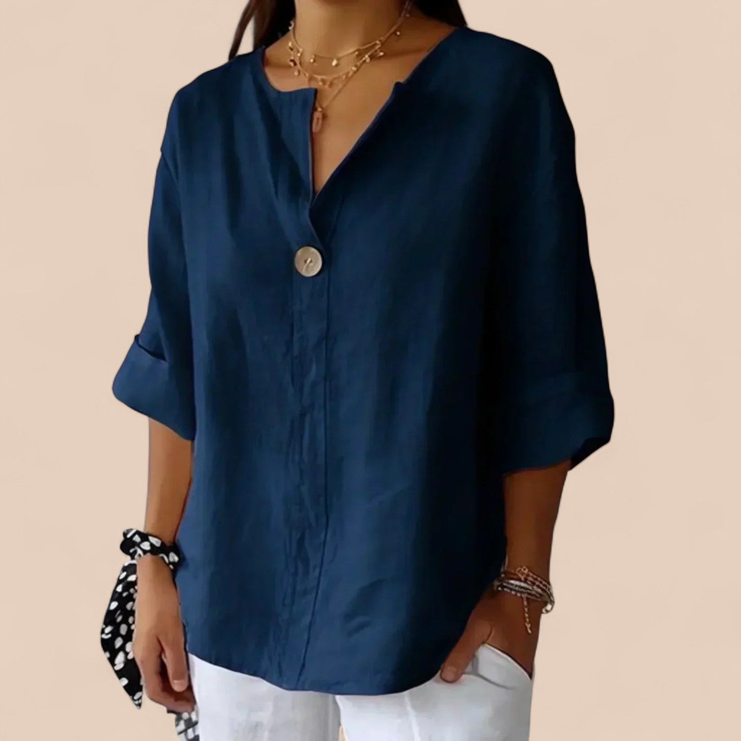 Entdecken Sie unsere Bluse im entspannten Stil, die Komfort und Eleganz perfekt vereint. Der fließende Schnitt und der V-Ausschnitt mit dekorativem Knopf verleihen ihr eine einzigartige Note und sind ideal für jeden Anlass, egal ob gemütlicher Spaziergang oder elegante Veranstaltung.
